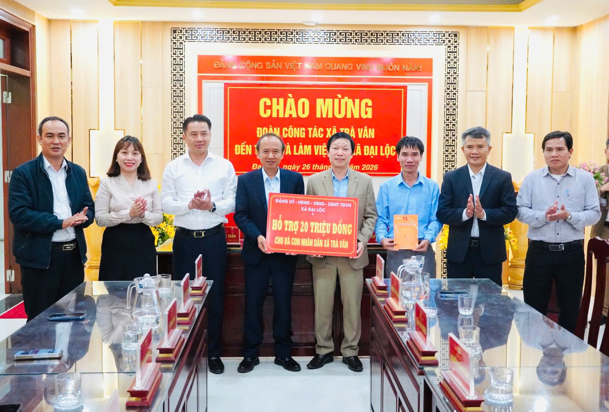 Tại buổi làm việc, lãnh đạo xã Đại Lộc đã thông tin khái quát tình hình phát triển kinh tế – xã hội, kết quả xây dựng nông thôn mới, công tác xây dựng Đảng và một số mô hình, cách làm hiệu quả đang triển khai trên địa bàn. Đồng thời trao tặng 20 triệu đồng hỗ trợ bà con nhân dân khó khăn xã Trà Vân nhân dịp Tết nguyên đán Bính Ngọ 2026.