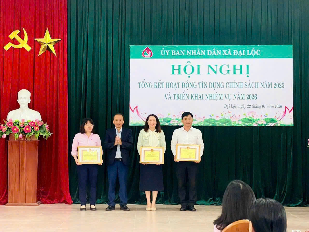 Nhân dịp này, UBND xã Đại Lộc đã khen thưởng cho 03 tập thể và 25 cá nhân có thành tích tiêu biểu trong công tác quản lý và triển khai tín dụng chính sách xã hội năm 2025, nhằm động viên, khích lệ các đơn vị và cá nhân tiếp tục phát huy vai trò, trách nhiệm trong thời gian tới. Chi nhánh  Ngân hàng Chính sách xã hội thành phố Đà Nẵng cũng trao 74 suất quà tặng cho các Tổ trưởng tổ tiết kiệm và vay vốn trong năm đồng hành cùng NHCSXH trong công tác quản lý nguồn vốn tín dụng chính sách.