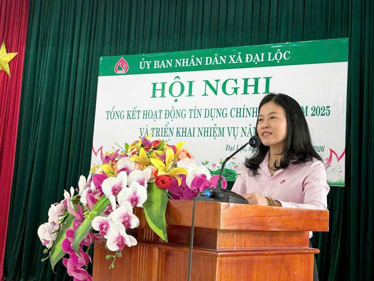 Thay mặt Chi nhánh NHCSXH thành phố Đà Nẵng, Đồng chí Đinh Thị Loan – Phó Giám đốc Chi nhánh đánh giá cao sự quan tâm lãnh đạo, chỉ đạo của cấp ủy, chính quyền xã Đại Lộc đối với hoạt động tín dụng chính sách. Đồng thời đề nghị xã tiếp tục phối hợp chặt chẽ với ngân hàng trong việc rà soát nhu cầu vay vốn, củng cố và nâng cao chất lượng hoạt động của các Tổ tiết kiệm và vay vốn, góp phần thực hiện hiệu quả các chương trình tín dụng chính sách trong năm 2026.