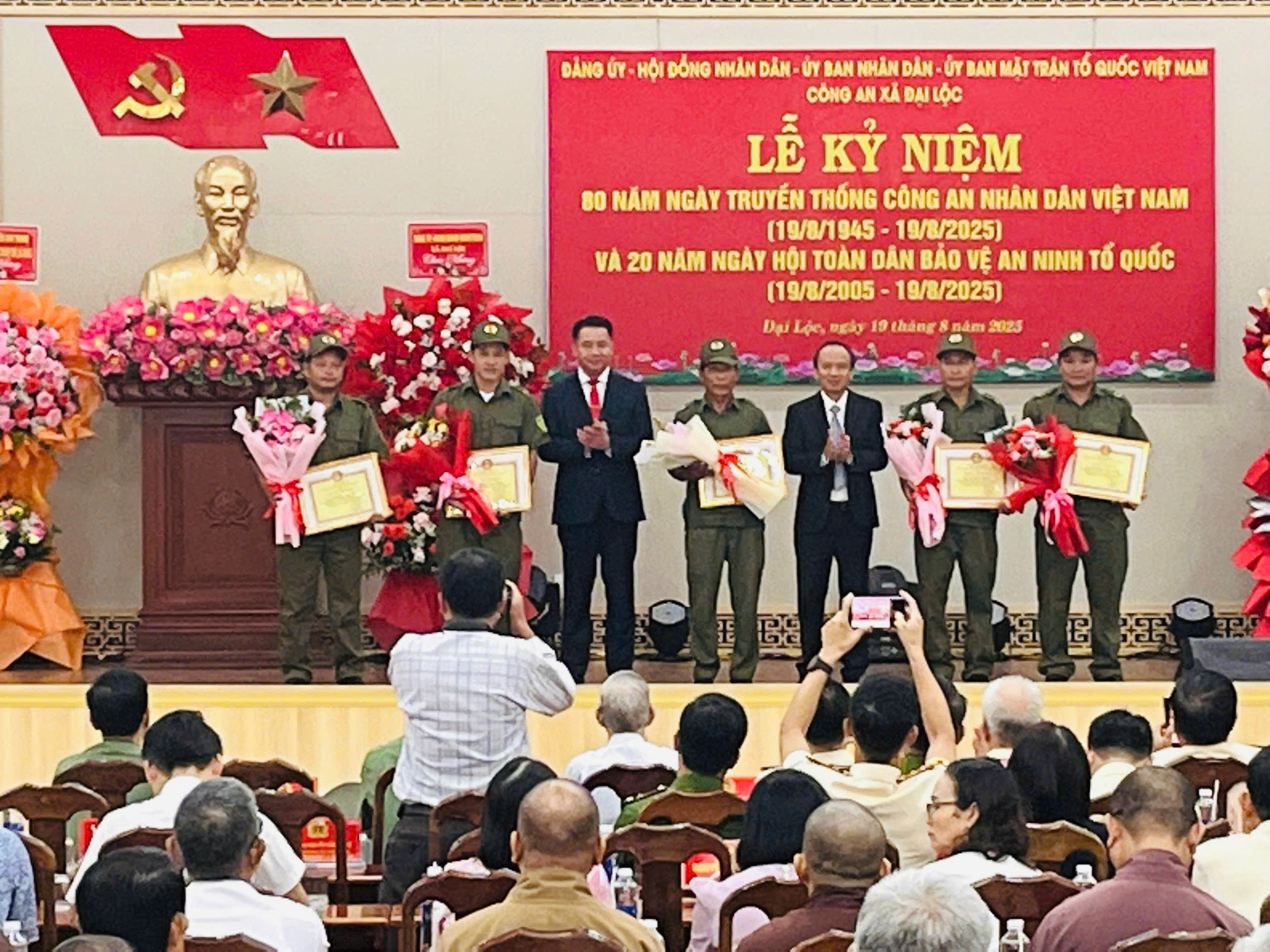 Sáng ngày 19/8/2025, Đảng uỷ-HĐND-UBND-UBMTTQVN xã Đại Lộc long trọng tổ chức Lễ kỷ niệm 80 năm Ngày truyền thống Công an Nhân dân Việt Nam (19/8/1945 - 19/8/2025) và 20 năm Ngày hội Toàn dân bảo vệ An ninh Tổ quốc (19/8/2005 - 19/8/2025).Tham dự buổi lễ có hơn 200 đại biểu đại diện lãnh đạo Công an thành phố, nguyên lãnh đạo Công an huyện Đại Lộc cũ; lãnh đạo Đảng uỷ, HĐND, UBND, UBMTTQVN, các cơ quan đơn vị và cán bộ, chiến sĩ công an xã.