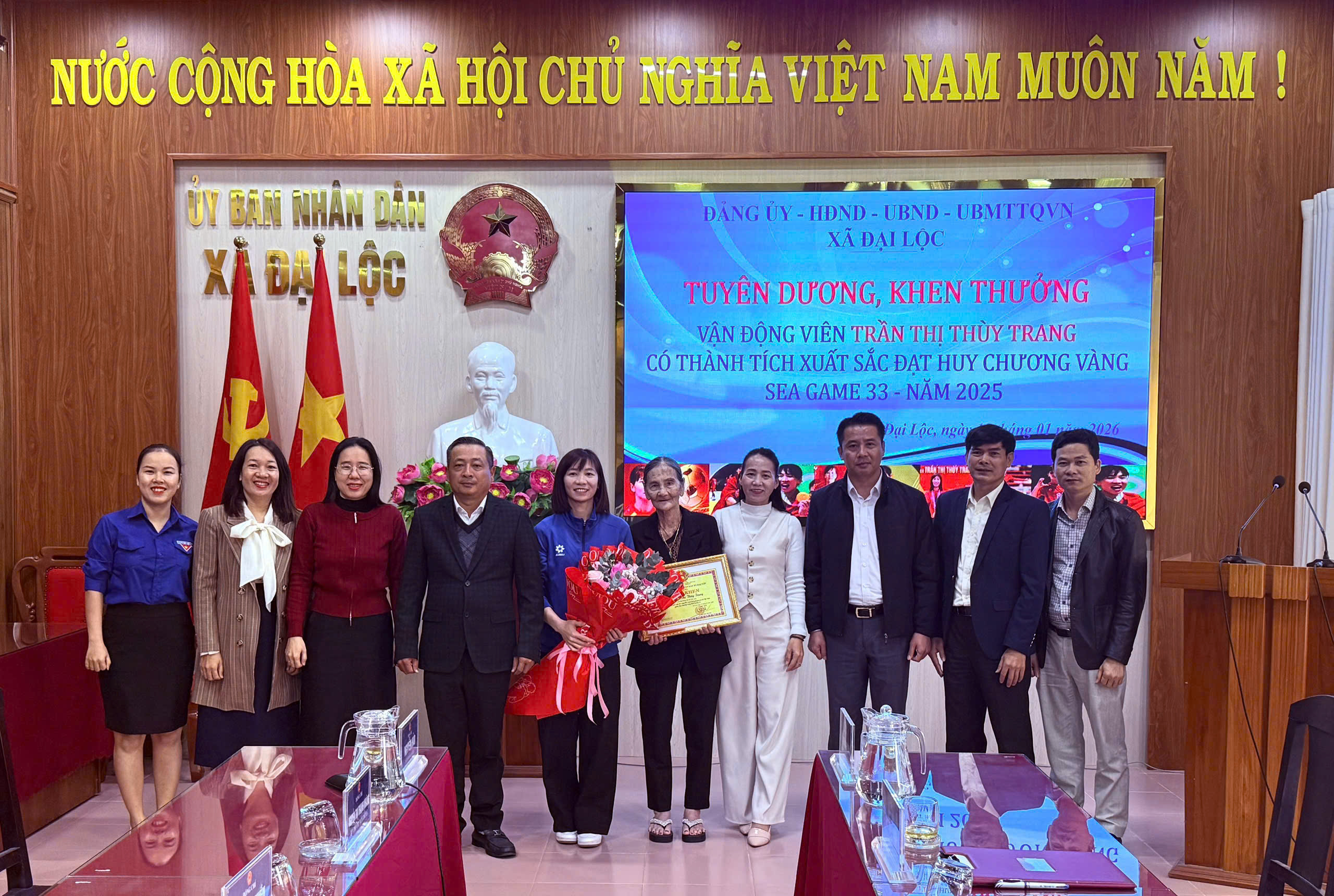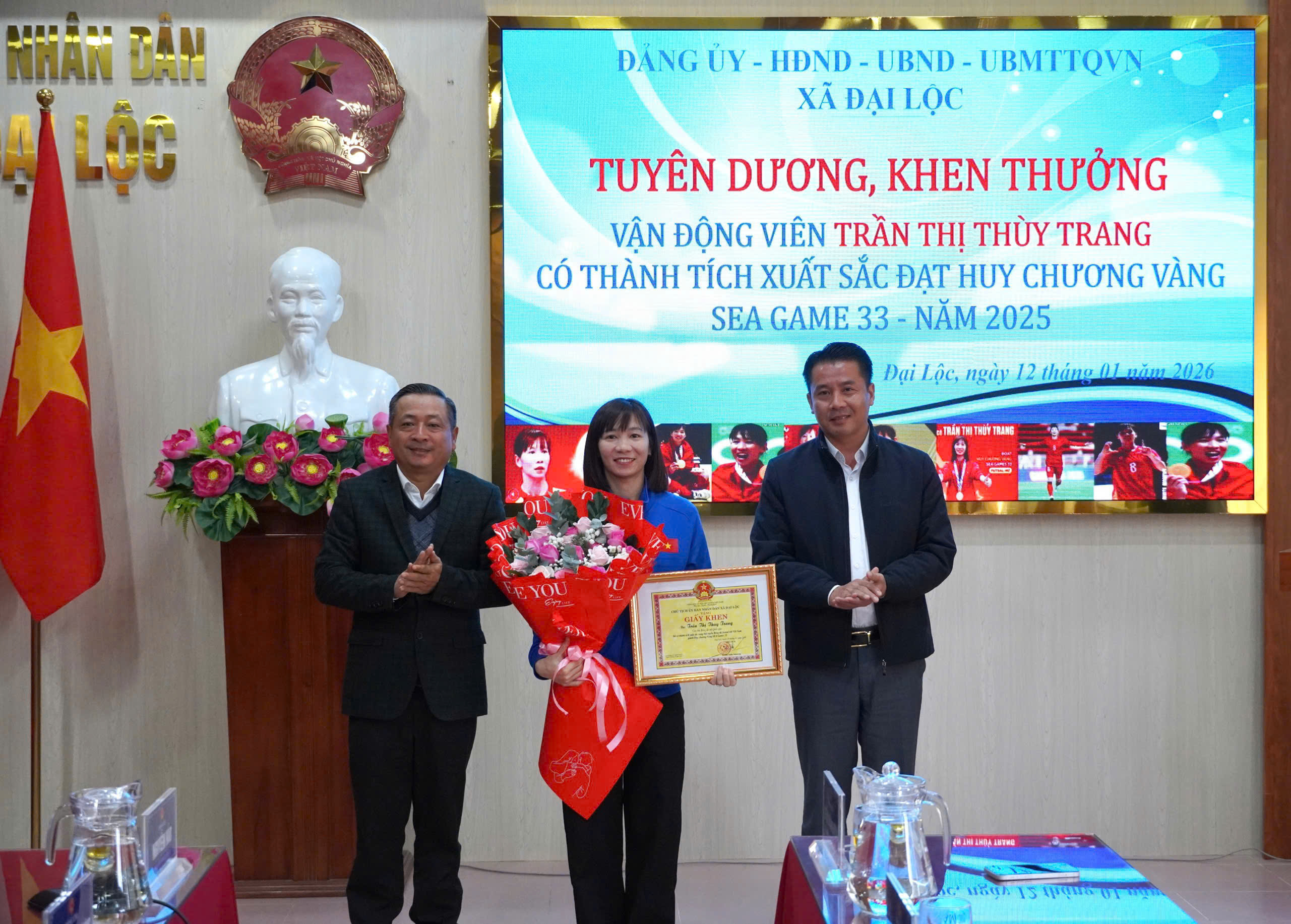 Dịp này, UBND xã Đại Lộc đã trao Giấy khen và phần thưởng nhằm ghi nhận những đóng góp, nỗ lực và thành tích xuất sắc của vận động viên Trần Thị Thùy Trang; đồng thời mong muốn em tiếp tục giữ vững phong độ, nỗ lực rèn luyện, cống hiến cho thể thao nước nhà và lan tỏa tinh thần thể thao đến thế hệ trẻ tại địa phương.